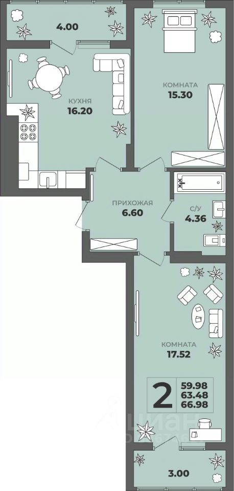 Продаётся 2-комнатная квартира в строящемся доме (Дом 1), срок сдачи: II-кв. 2027, общей площадью 63.48 кв.м., на 7 этаже. ЖК ''ГРИНВУД''.