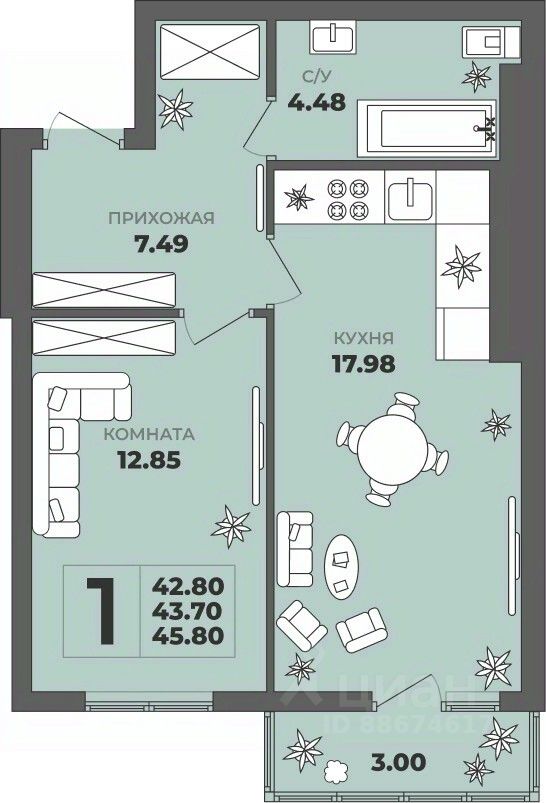 Продаётся 1-комнатная квартира в строящемся доме (Дом 2), срок сдачи: II-кв. 2027, общей площадью 43.7 кв.м., на 3 этаже. ЖК ''ГРИНВУД''.