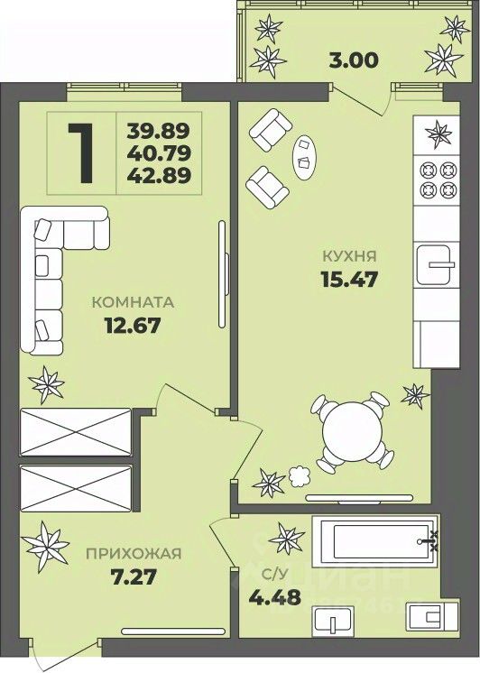 Продаётся 1-комнатная квартира в строящемся доме (Дом 2), срок сдачи: II-кв. 2027, общей площадью 40.79 кв.м., на 7 этаже. ЖК ''ГРИНВУД''.