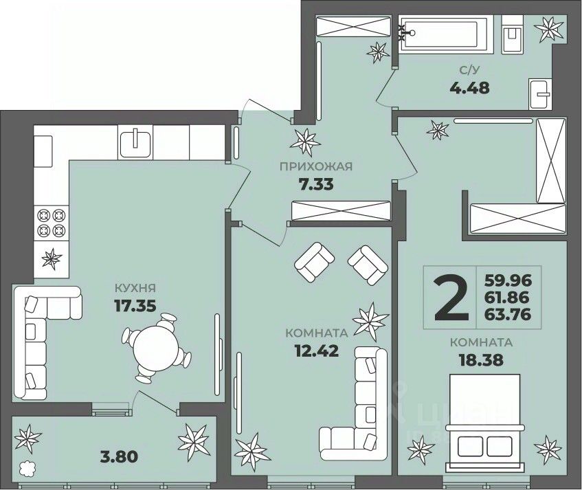Продаётся 2-комнатная квартира в строящемся доме (Дом 2), срок сдачи: II-кв. 2027, общей площадью 61.86 кв.м., на 3 этаже. ЖК ''ГРИНВУД''.