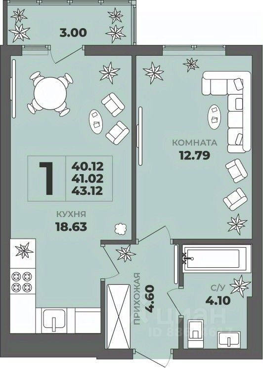 Продаётся 1-комнатная квартира в строящемся доме (Дом 2), срок сдачи: II-кв. 2027, общей площадью 41.02 кв.м., на 7 этаже. ЖК ''ГРИНВУД''.