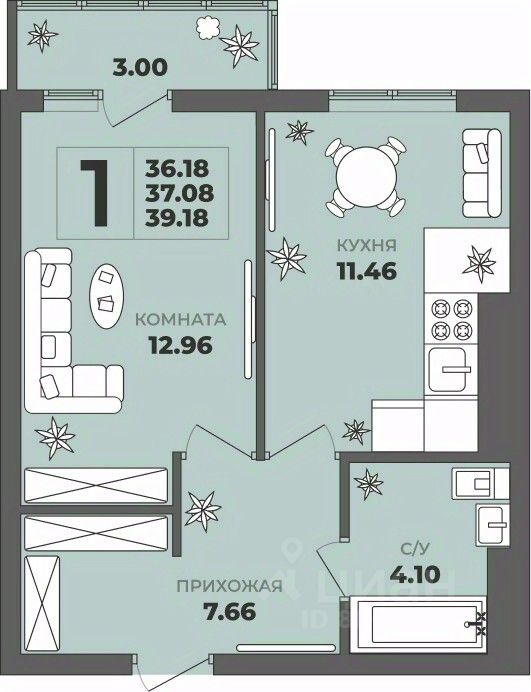 Продаётся 1-комнатная квартира в строящемся доме (Дом 2), срок сдачи: II-кв. 2027, общей площадью 37.08 кв.м., на 7 этаже. ЖК ''ГРИНВУД''.