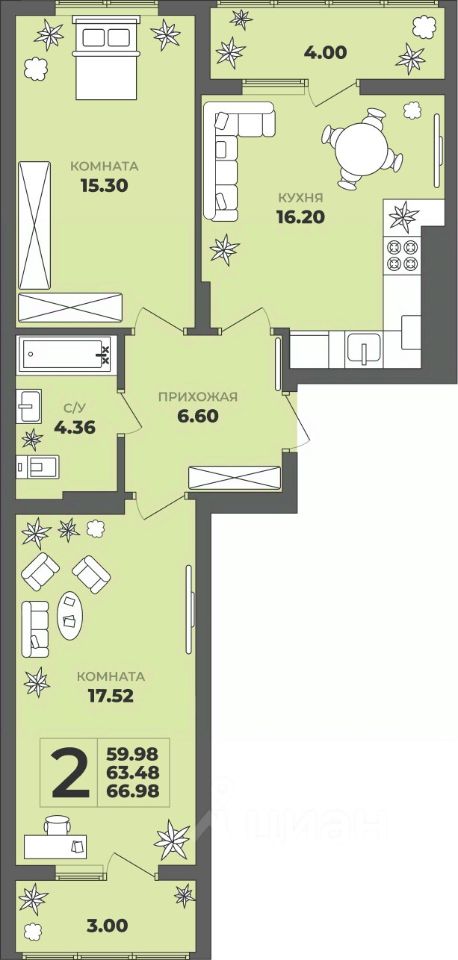 Продаётся 2-комнатная квартира в строящемся доме (Дом 1), срок сдачи: II-кв. 2027, общей площадью 63.48 кв.м., на 5 этаже. ЖК ''ГРИНВУД''.