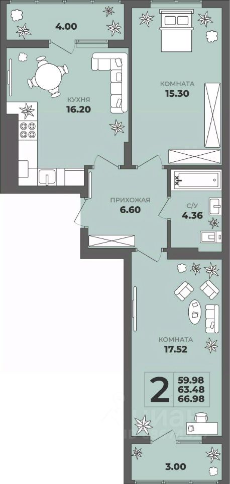 Продаётся 2-комнатная квартира в строящемся доме (Дом 1), срок сдачи: II-кв. 2027, общей площадью 63.48 кв.м., на 4 этаже. ЖК ''ГРИНВУД''.