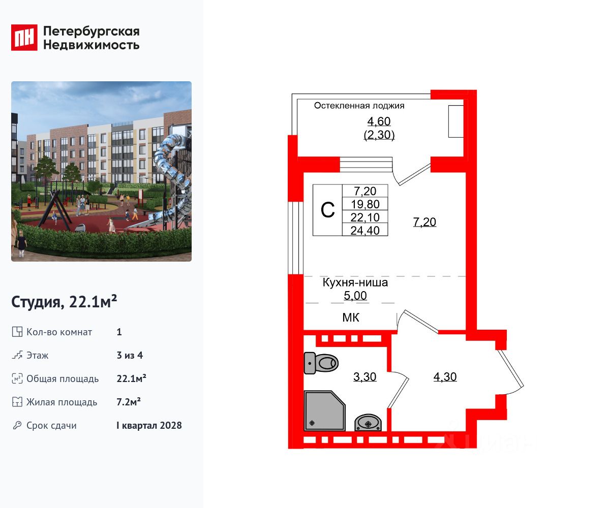 Удобная, классическая, функциональная европланировка, большая кухня-гостиная 5 м², просторная прихожая 4.3 м². Общая площадь студии - 22.1 м², жилая 7.2 м², высота потолка 2.7 м.