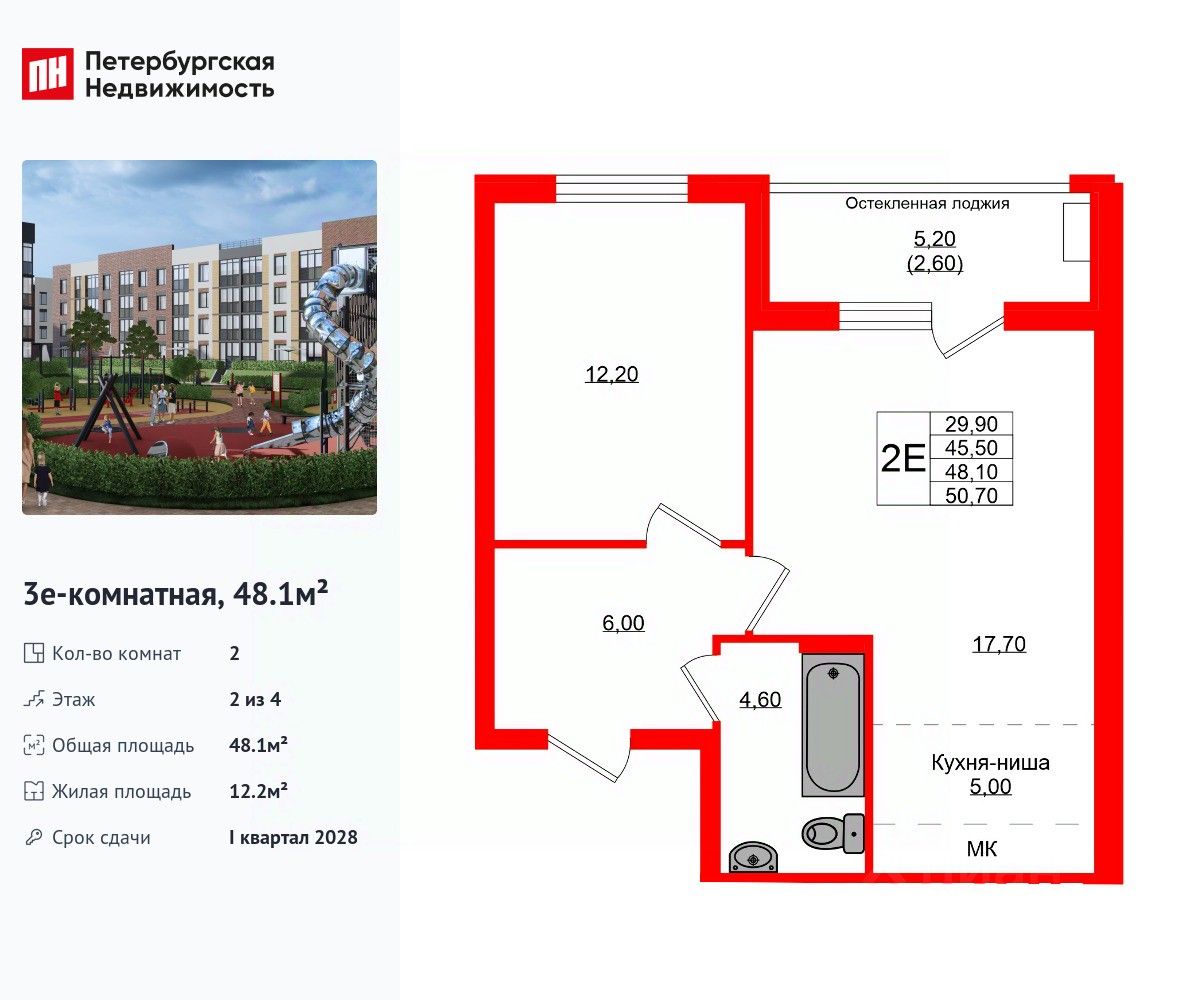 Удобная, классическая, функциональная европланировка, большая кухня-гостиная 22.7 м², вместительная прихожая 6 м². Общая площадь квартиры - 48.1 м², жилая 12.2 м², высота потолка 2.7 м.