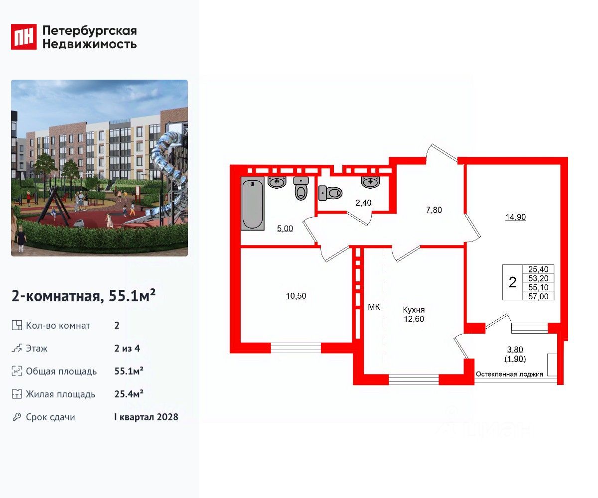 Удобная, классическая планировка, кухня 12.6 м², просторная прихожая 7.8 м². Общая площадь квартиры - 55.1 м², жилая 25.4 м², высота потолка 2.7 м.