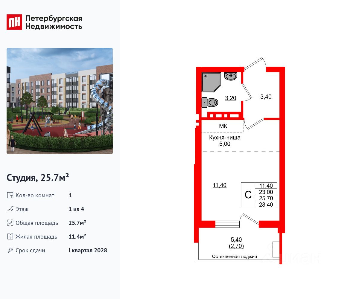 Удобная, классическая, функциональная европланировка, большая кухня-гостиная 5 м², просторная прихожая 3.4 м². Общая площадь студии - 25.7 м², жилая 11.4 м², высота потолка 2.7 м.