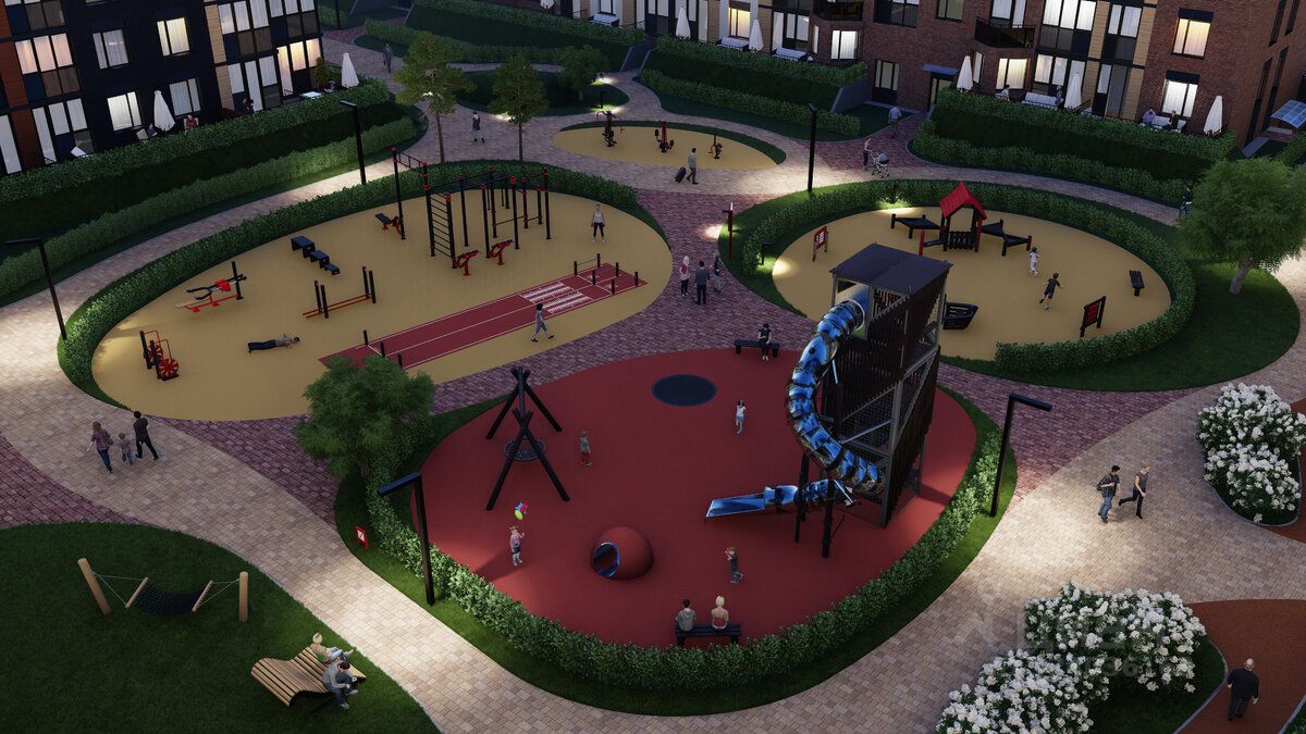 • Дизайнерские детские площадки, зоны для спорта и активного отдыха, велодорожки