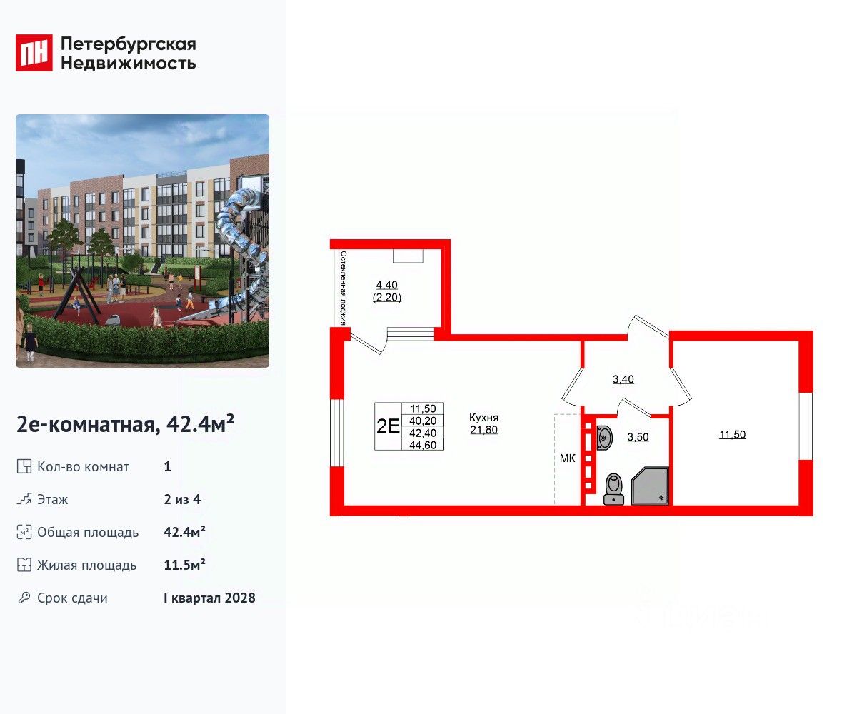 Удобная, классическая, функциональная европланировка, большая кухня-гостиная 21.8 м², вместительная прихожая 3.4 м². Общая площадь квартиры - 42.4 м², жилая 11.5 м², высота потолка 2.7 м.