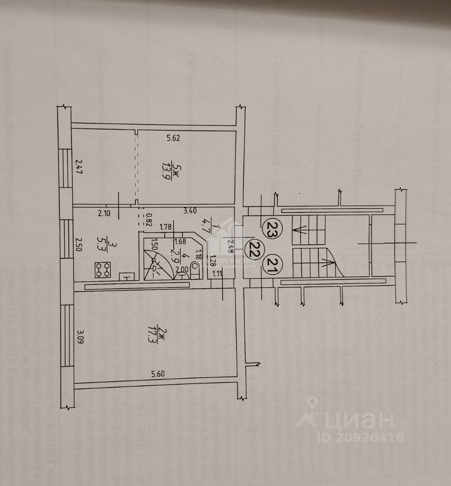 Квартира расположена на 1 высоком этаже пятиэтажного кирпичного дома 1970 года постройки. Общая площадь составляет 44,1 кв. м, из которых 31,2 кв. м — жилая площадь. Две изолированные комнаты имеют площадь 13,9 кв. м и 17,3 кв. м, кухня — 5,3 кв. м.