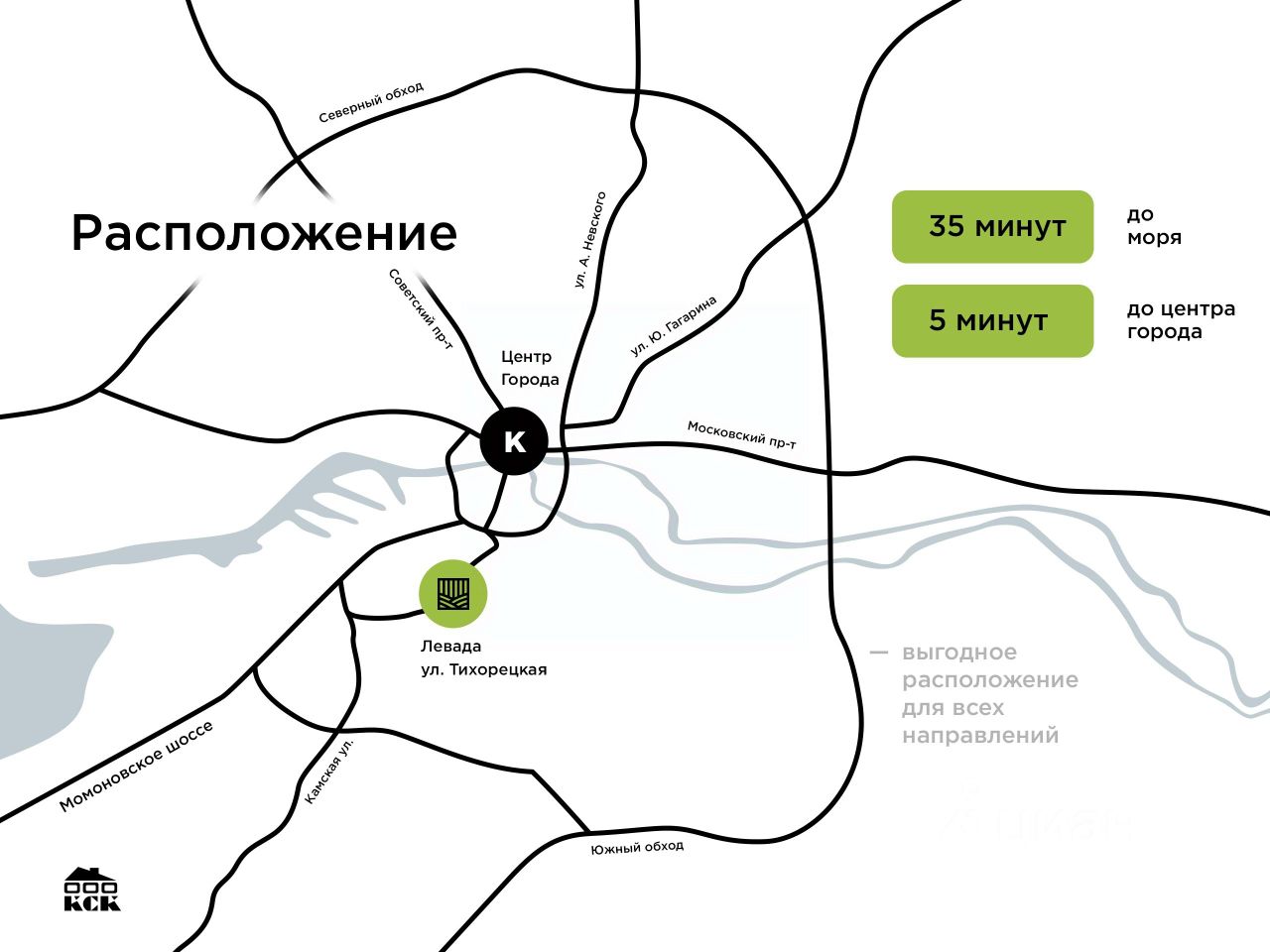 Комплекс расположен в Московском районе Калининграда в максимальной близости к центру, визуально соединяя исторические сложившиеся части города северную и южную. 5 минут до центра города. Насыщенный инфраструктурой район включает в себя большое количество школ и детских садов, а близость парка Южный создает повод для прогулок и семейного отдыха.
