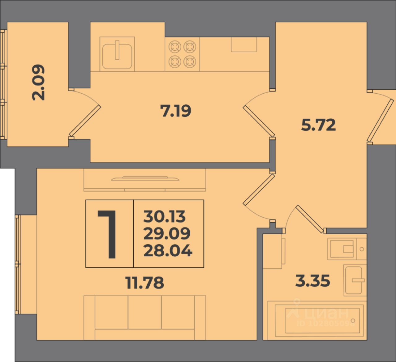 Общая площадь30,13 м2