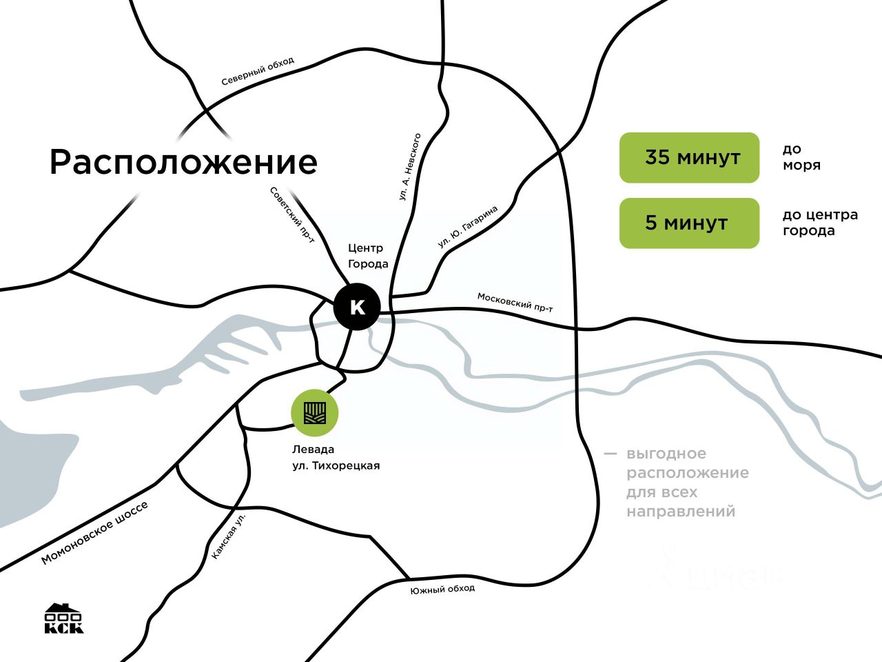 Комплекс расположен в Московском районе Калининграда в максимальной близости к центру, визуально соединяя исторические сложившиеся части города северную и южную. 5 минут до центра города. Насыщенный инфраструктурой район включает в себя большое количество школ и детских садов, а близость парка Южный создает повод для прогулок и семейного отдыха.