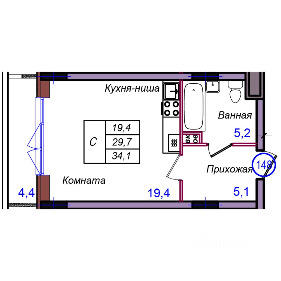Общая площадь34,1 м2