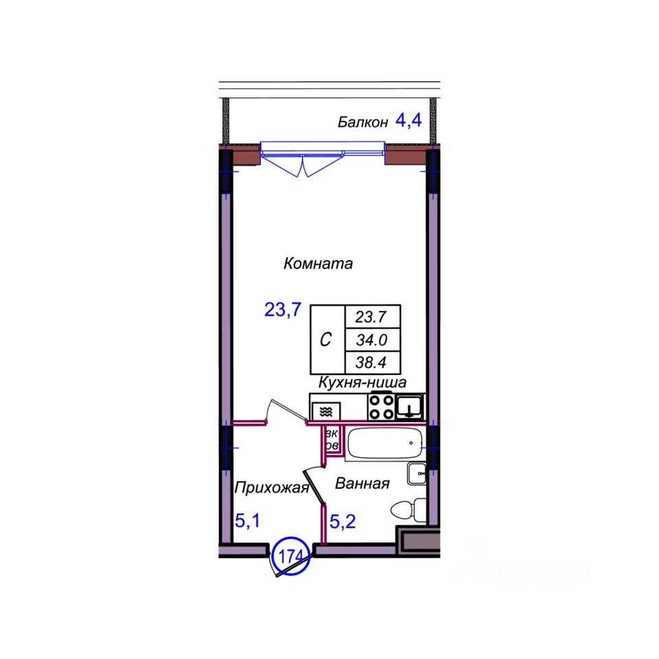 Общая площадь38,4 м2