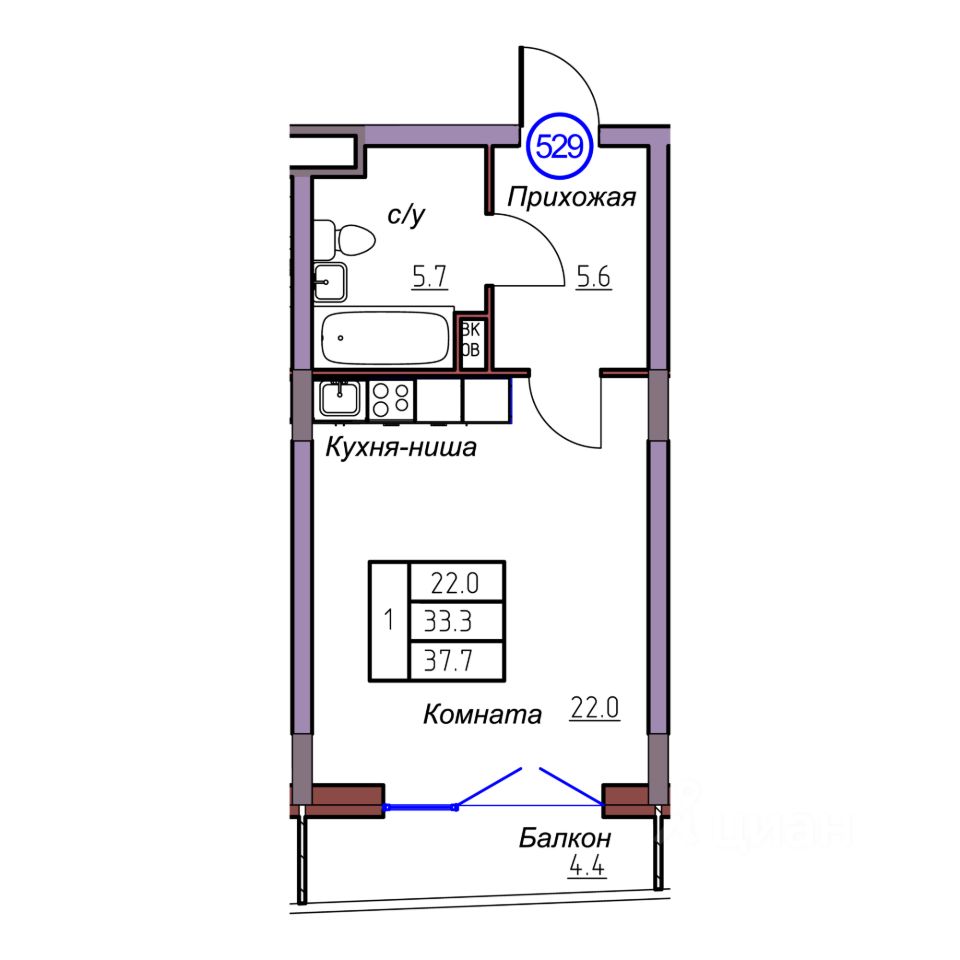 Общая площадь37,7 м2