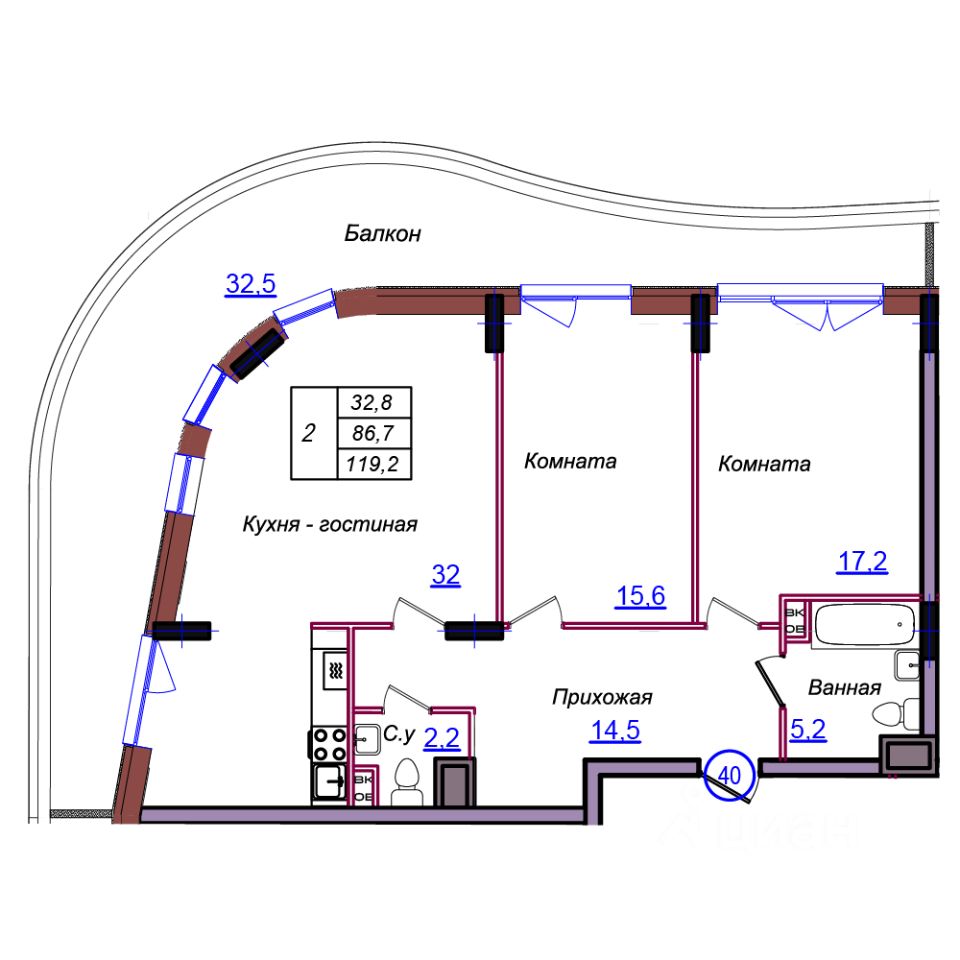 Жилая площадь32,8 м2