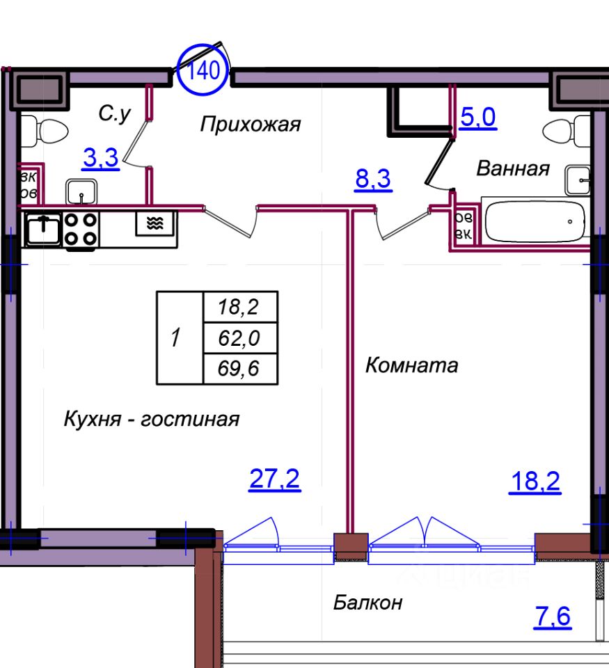 Общая площадь69,6 м2