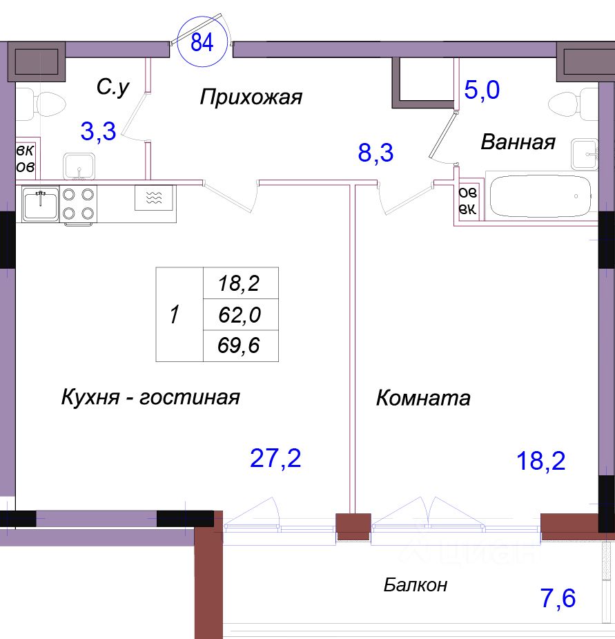 Общая площадь69,6 м2