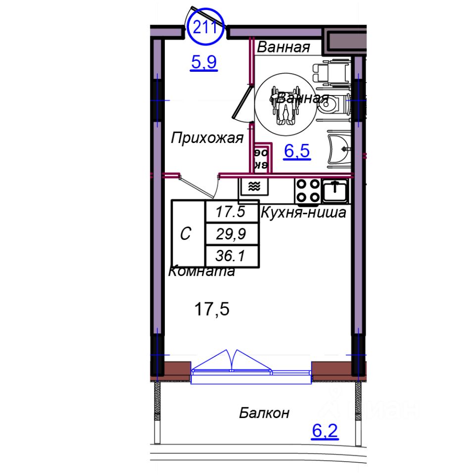Общая площадь36,1 м2