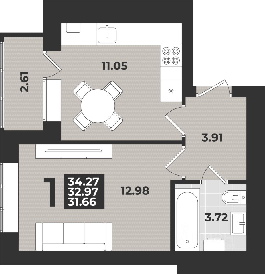 Продаётся 1-комнатная квартира в строящемся доме (Дом 3 (1 этап)), срок сдачи: II-кв. 2026, общей площадью 34.27 кв.м., на 1 этаже. Новый жилой комплекс ''11 Мая'' от застройщика ''ГК Модуль-Стройград'' расположен по адресу: г. Калининград, улица Согласия.