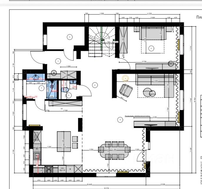 Два этажа - 1 этаж: роскошная просторная кухня-гостиная 61 кв.м. — место для жизни и приёма гостей, комната (спальня) для гостей 14,6 кв.м, техническое помещение, гостевой санузел 2,5 кв.м и ванная комната 3,3 кв.м,