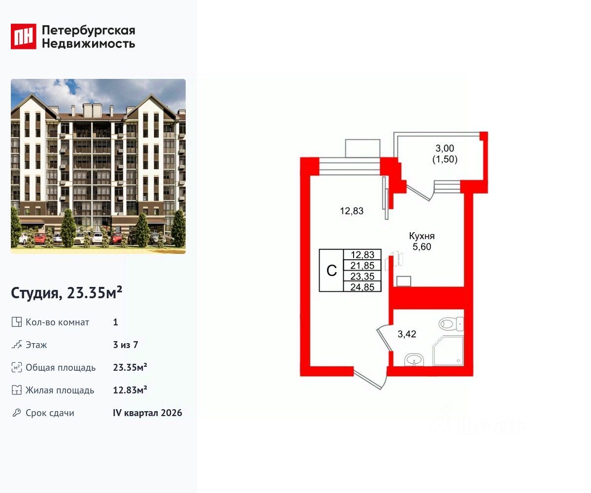Удобная, классическая, функциональная европланировка, большая кухня-гостиная 5.6 м². Общая площадь студии - 23.35 м², жилая 12.83 м², высота потолка 3 м.