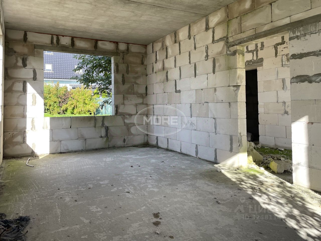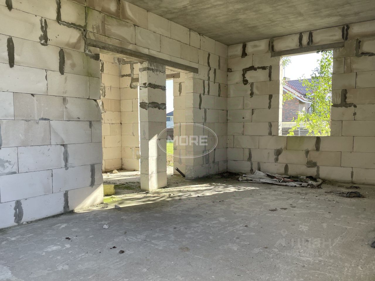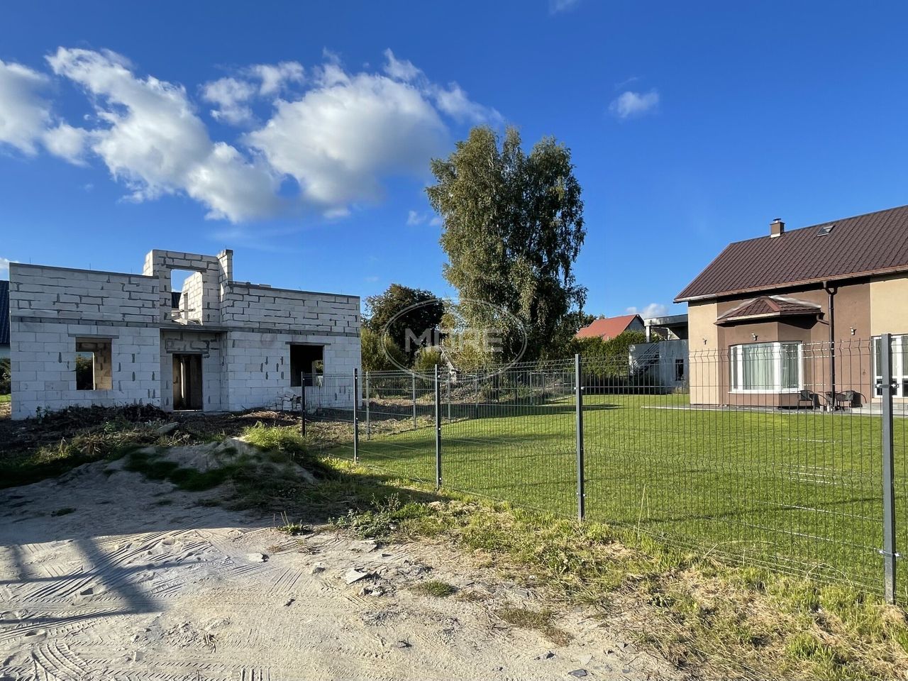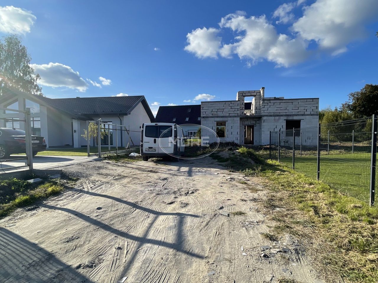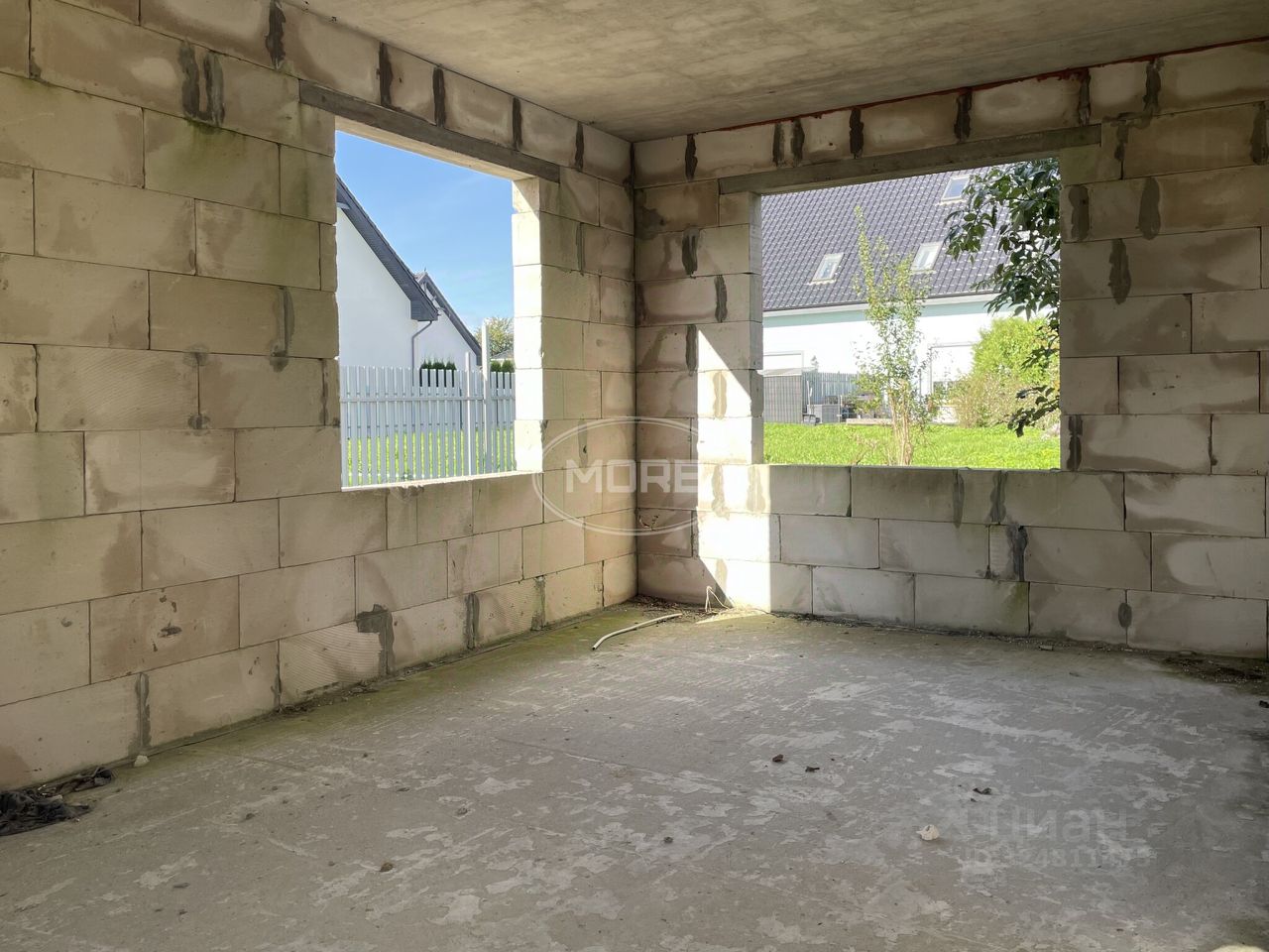 На участке начато строительство дома (залит качественный фундамент-плита, частично возведены стены второго этажа, ж\б перекрытия)