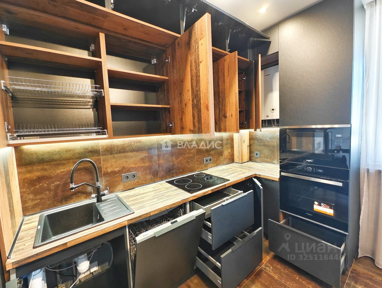 Встроенная кухня сделана на заказ, фурнитура BLUM. В квартире, остаётся всё, что на фотографиях: мебель, техника: стиральная машина SAMSUNG, холодильник SAMSUNG BESPOKE, духовка, микроволновка WHIRLPOOL, посудомойка.