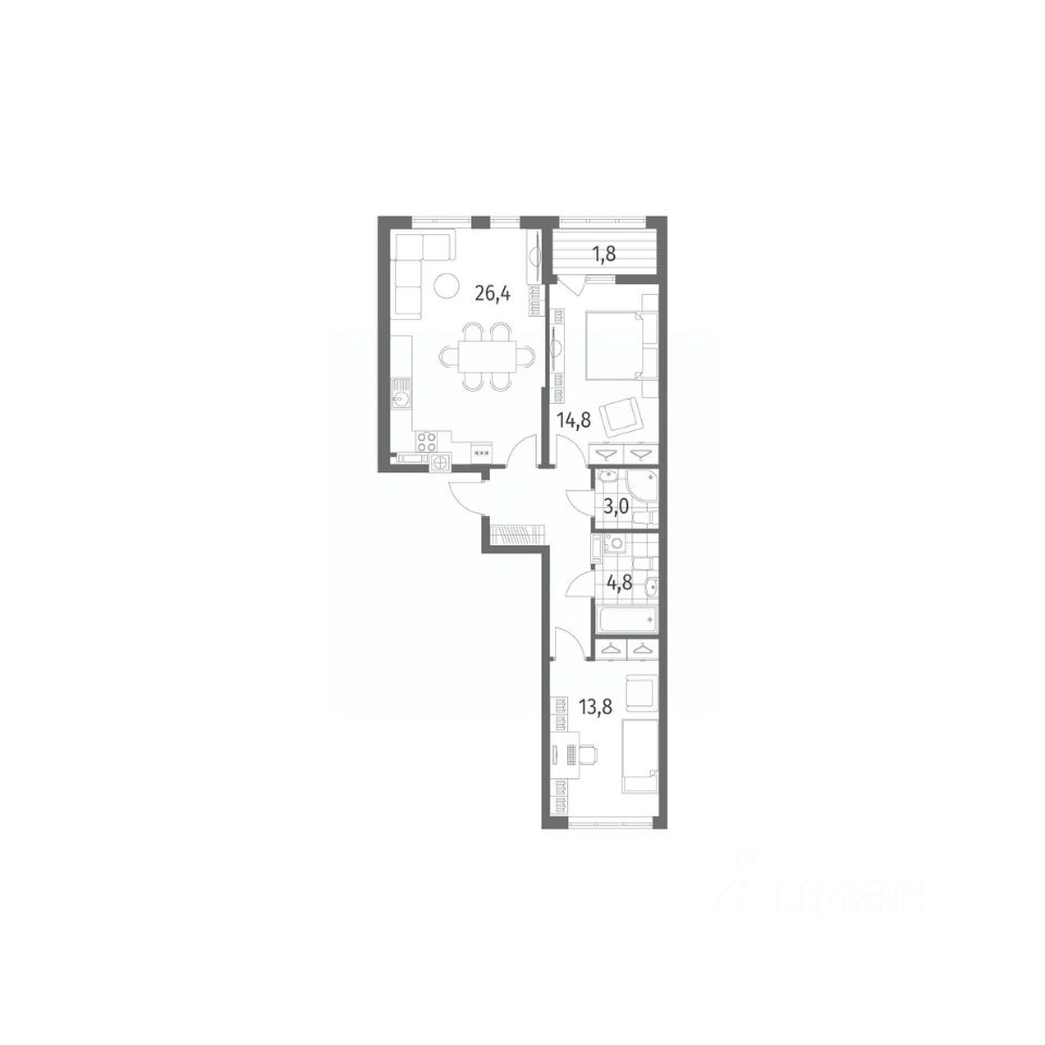Продается квартира площадью 73.8 м² на 5 этаже 2 секции в Дом на Красной от компании ГК ''ТРЕСТ''. Площадь кухни 26.4 м². Жилой комплекс комфорт-класса ''Дом на Красной'' расположен в Центральном районе Калининграда на пересечении улиц Красная и Псковская. Жилой комплекс включает в себя два дома высотой 8 этажей. Срок сдачи намечен на 4 квартал 2026 года.