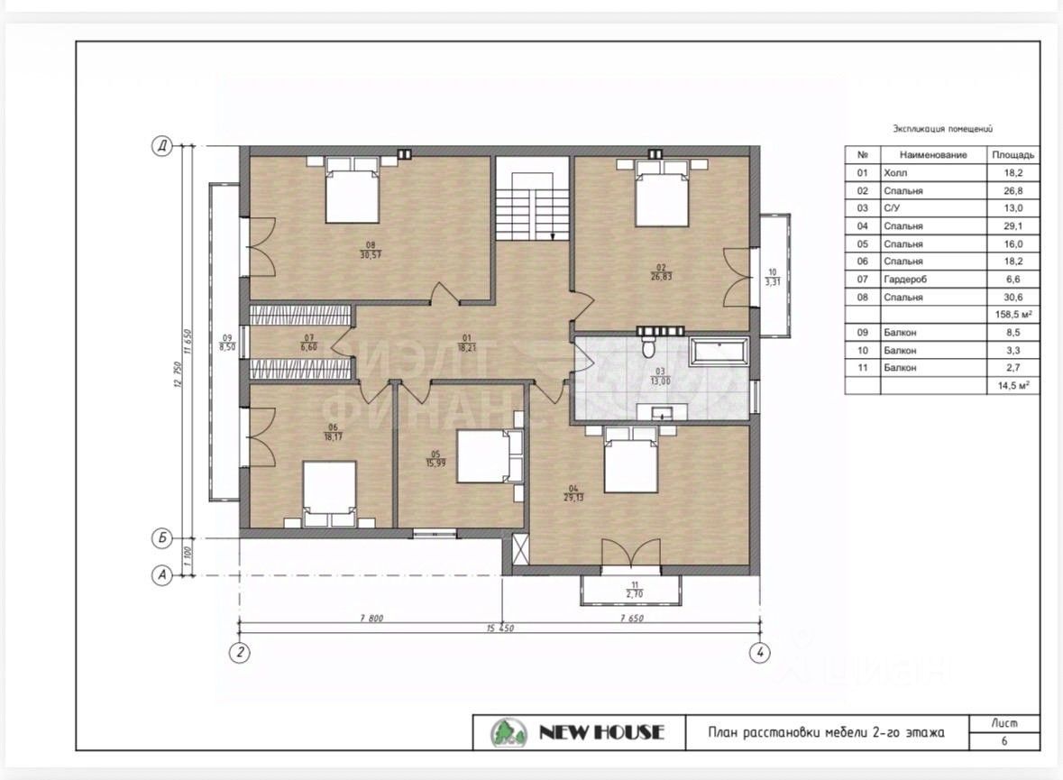 Планировка: 1й этаж: - Кухня-гостинная 64,17 м - Гардеробная 11,88 м - Санузел 5,28 м - Сауна + душевая 12,63 м - Душ 5,28 м - Гараж 34.34 м ( имеет вход с дома, улицы, совмещён с тех помещением/топочной 6,48 м с дополнительном выходом на улицу) - Кладовая 6,71 м , коридор 16,72 м 2й этаж: - 5 спален (30,5 м, 18,2 м, 15,9 м, 29,1 м, 26,8 м, с каждой спальни выход на индивидуальный балкон). - Ванная 13 м - Гардеробная 6,60 м
