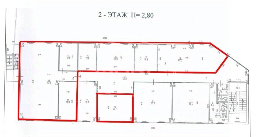 Площадь сдаваемых помещений 2-го этажа 230 м2, кабинетная система.