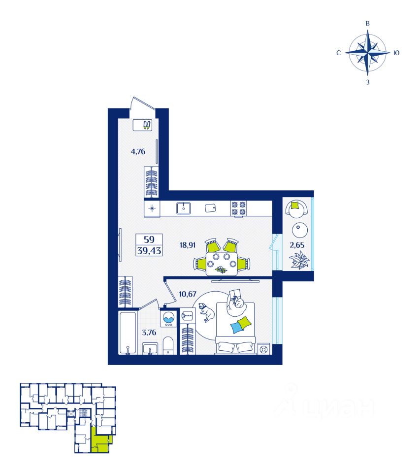 Общая площадь39,43 м2