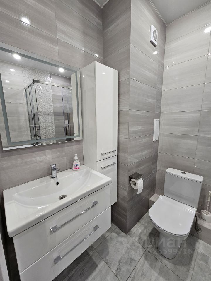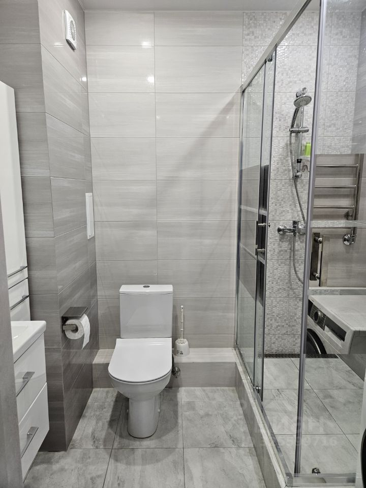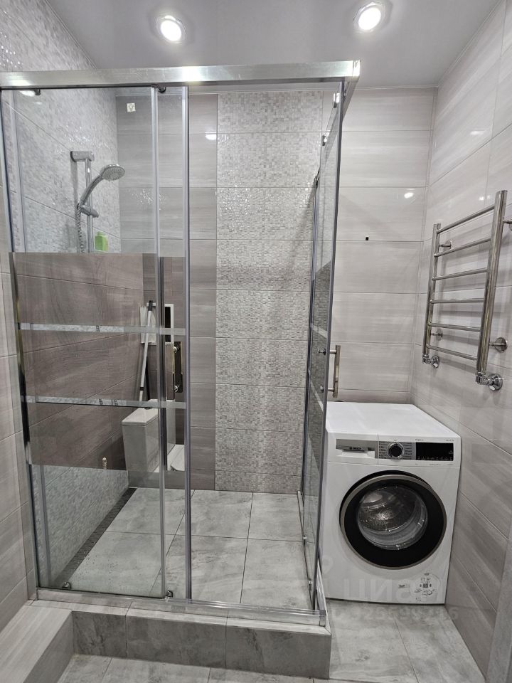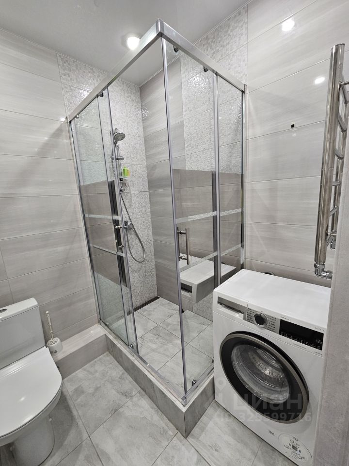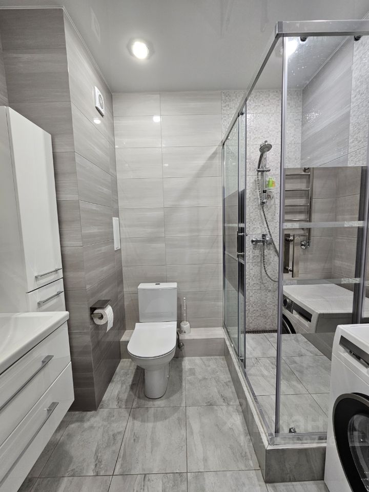 В совмещенном санузле установлена душевая кабина и стиральная машина.