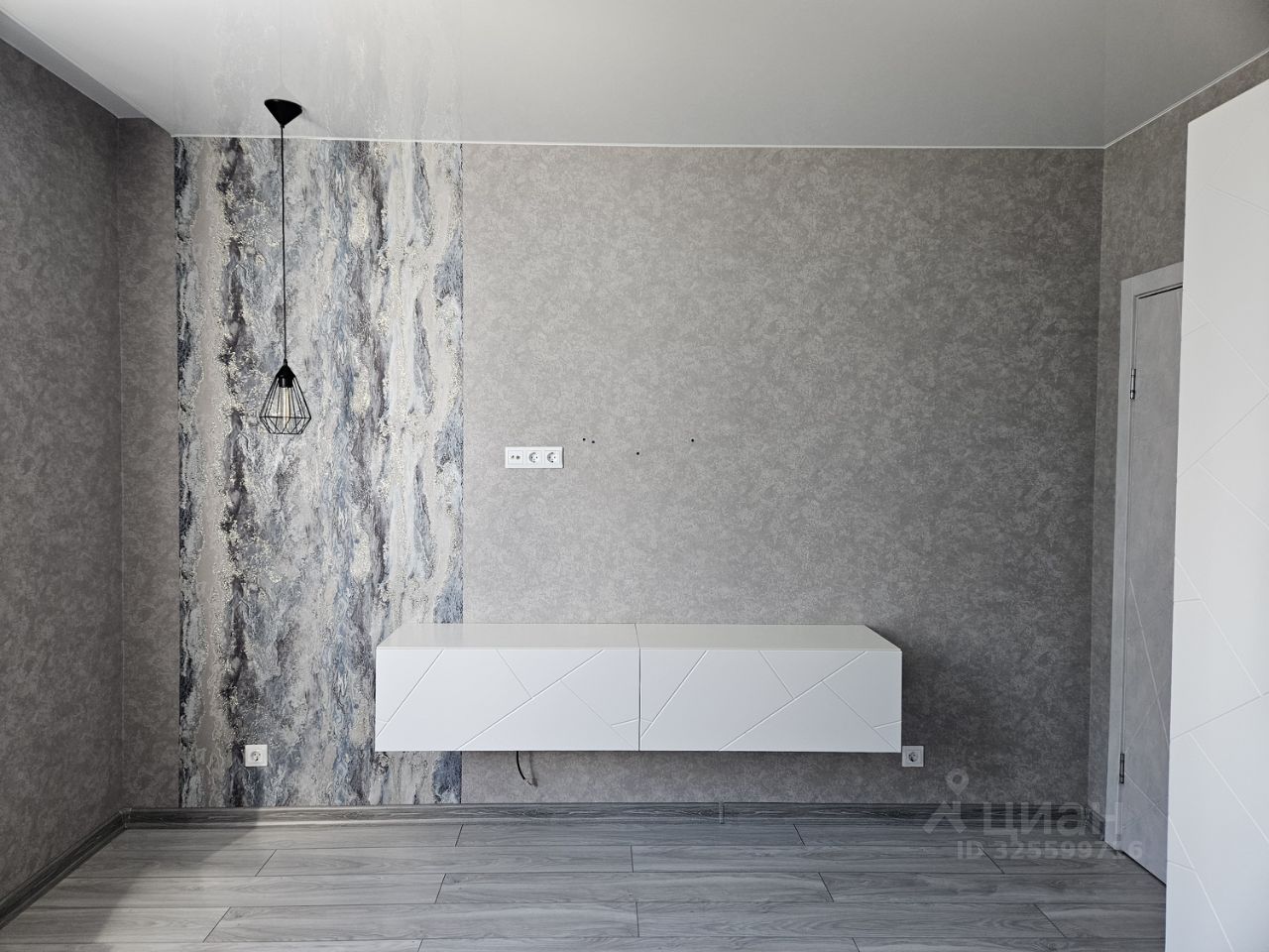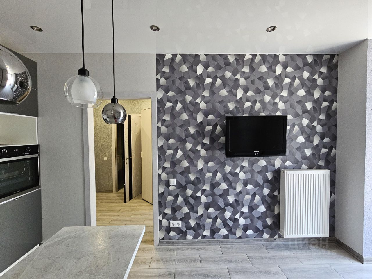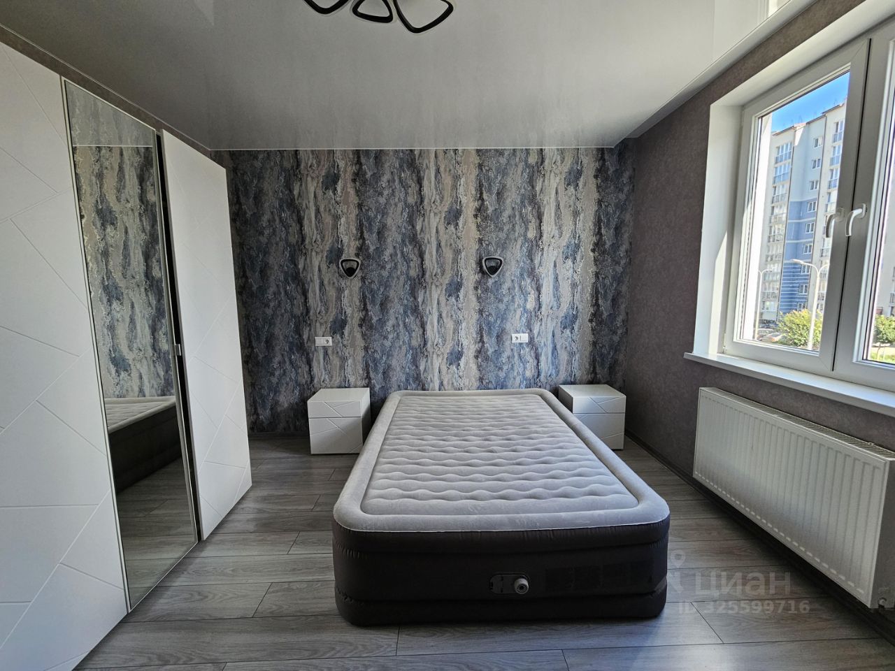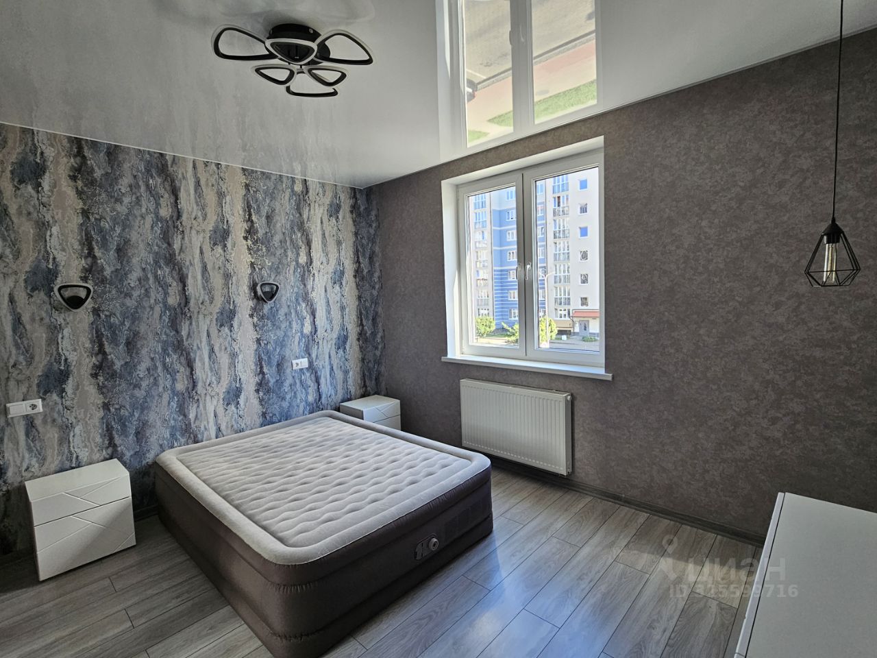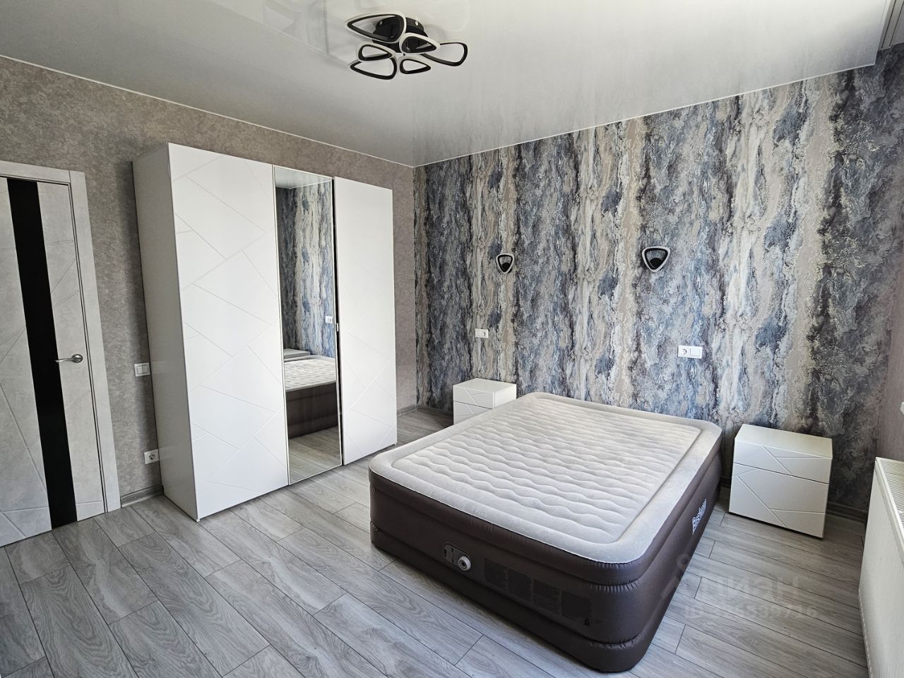 Комната оформлена стильными обоями с абстрактным узором, что создает атмосферу уюта и современности.