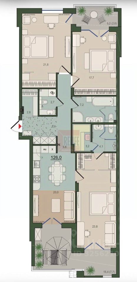 Общая площадь квартиры 126 кв.м. Планировка квартиры функциональна и продумана до мелочей, что обеспечивает достойное и комфортное проживание. Просторная кухня-гостиная площадью 20 кв.м. с выходом на террасу. Три комнаты 23,8+21,8+17,7 кв.м. с выходом на террасы. Два совмещенных санузла и гостевой санузел. Баня! Высота потолков 3 метра. Автономное отопление регулируется компактным теплопунктом в квартире, установлена система теплый пол. Дом сдан.