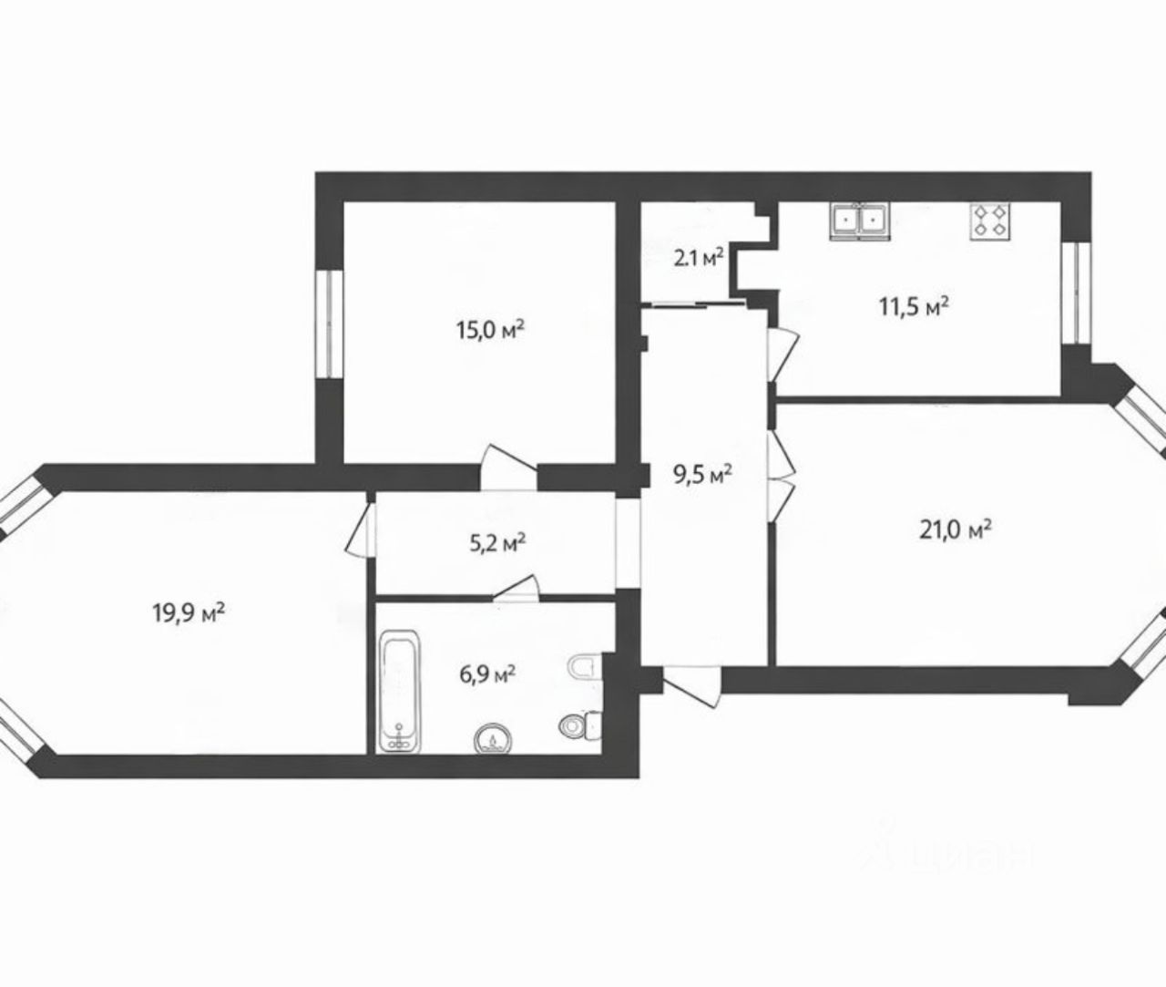 Планировка и характеристики Квартира с удобной и функциональной планировкой: * 3 изолированные комнаты:• 21,0 м²• 19,9 м²• 15,0 м² * Кухня — 11,5 м² * Просторный холл — 9,5 м² * Дополнительные помещения:• ванная комната — 6,9 м²• коридор — 5,2 м²• кладовая/ниша — 2,1 м² Окна выходят на разные стороны, квартира светлая и хорошо проветриваемая. Все комнаты изолированы — удобно как для семьи, так и для сдачи в аренду.