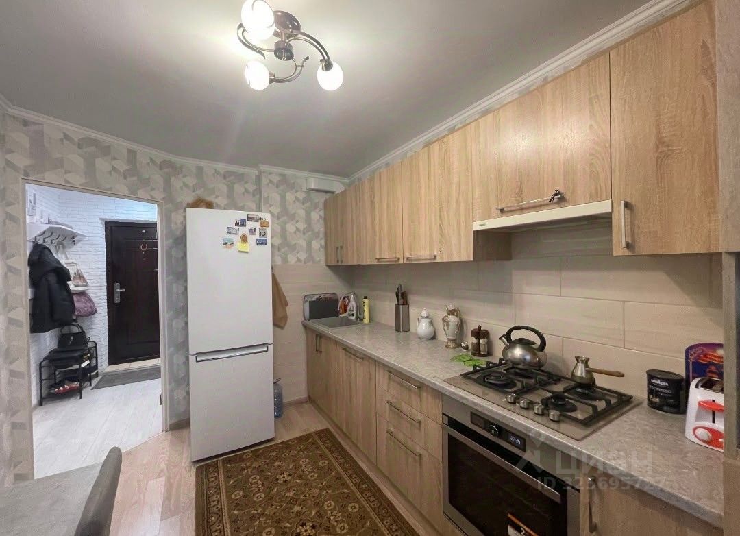 С мебелью и техникой. Посуда. Комната разделена на две зоны.