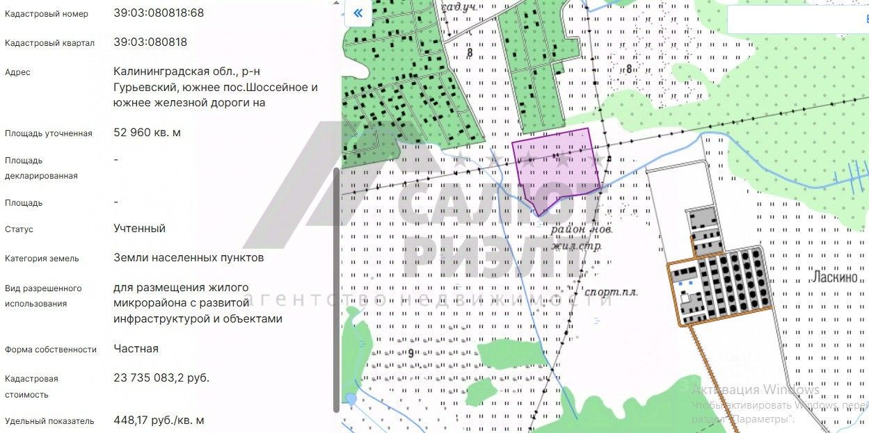 Арт. 42258340 Земельный участок площадью 5.29 Га, расположенный рядом с посёлком ''Ласкино парк'' (ориентир - п. Ласкино). Категория: земли поселений (земли населённых пунктов). Разрешённое использование: для размещения жилого микрорайона с развитой инфраструктурой и объектами соцкультбыта, производственных и коммунально-складских объектов. Зона Ж4Б (зона застройки индивидуальными жилыми домами). Кадастровый номер 39:03:080818:68. Участок находится в шаговой доступности к коттеджному посёлку ''Ласкино-парк''. Практически до самого участка идёт обустроенная дорога из тротуарной плитки. Рядом продаём участок с аналогичными характеристиками по той же цене. Кадастровый номер 39:03:080818:200. На оба участка есть ГПЗУ 2025 г. Ориентиры: Ласкино, Шоссейное, ул. Сиреневая, Луговая, Мебельная, Южная, переулок Кузнечный, Южный.