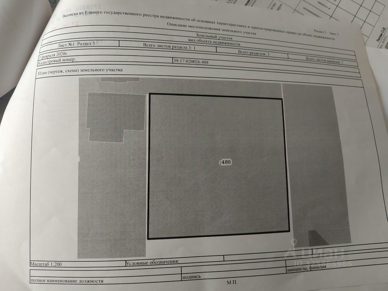Кадастровый номер --- 39:17:020026:488 --- Статус: Учтенный Категория земель: Земли поселений (земли населенных пунктов) Форма собственности: Частная собственность Уточненная площадь: 404 кв.