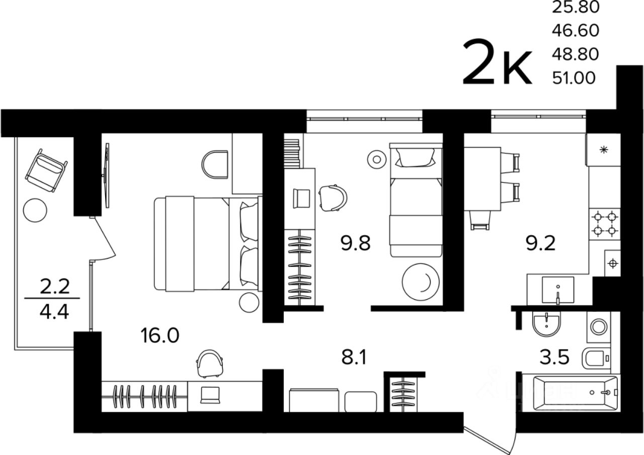 Общая площадь48,8 м2