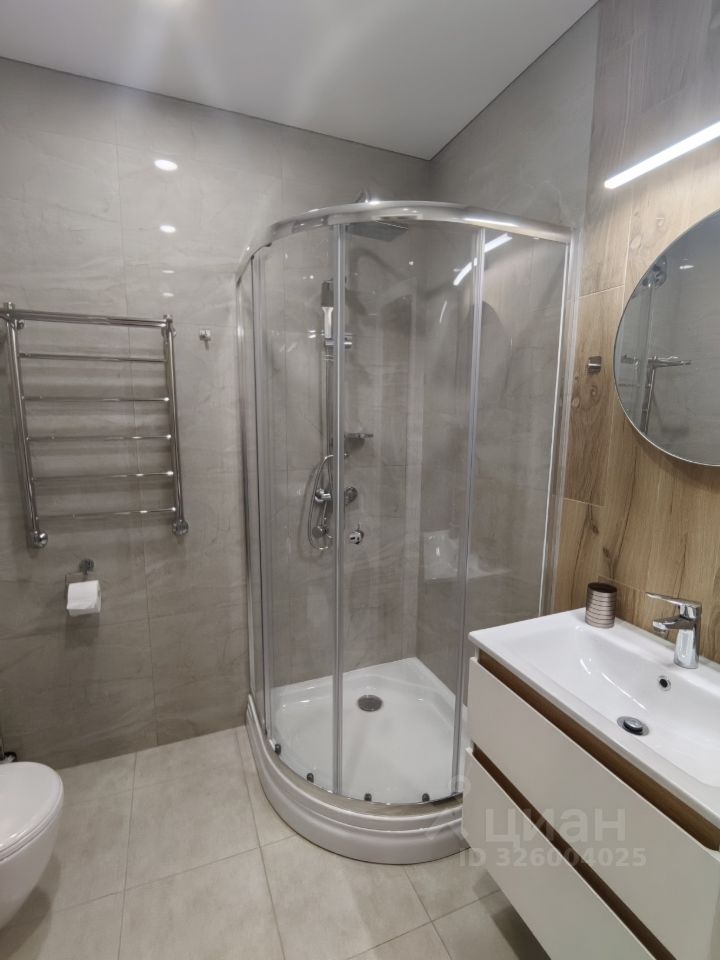 Санузел совмещенный, с душевой кабиной, стильной сантехникой и стиральной машиной.