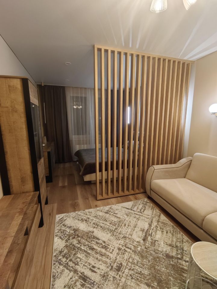 В квартире выполнен дизайнерский ремонт. Просторная гостиная оборудована диваном и телевизором с цифровым ТВ. За перегородкой расположена двухспальная кровать с ортопедическим матрасом. Спальные принадлежности (подушки, одеяло, постельное бельё и полотенца) предоставляются.