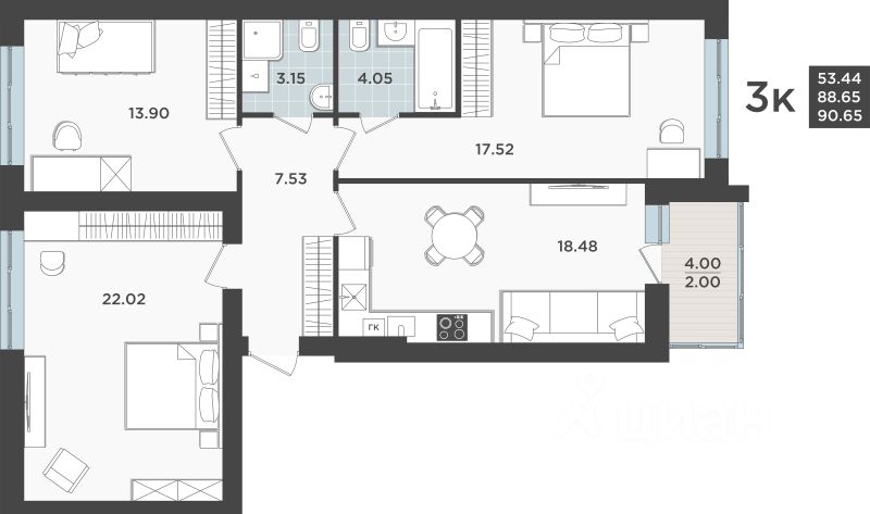 Общая площадь88,65 м2