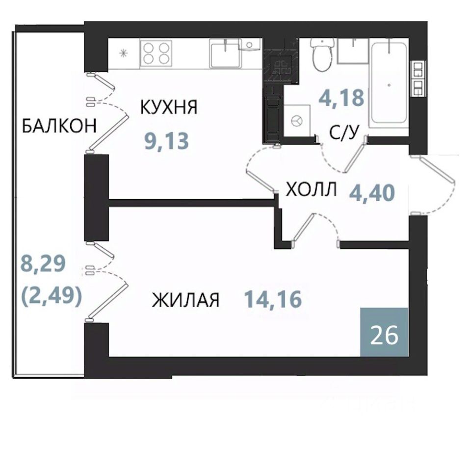 Общая площадь34,36 м2