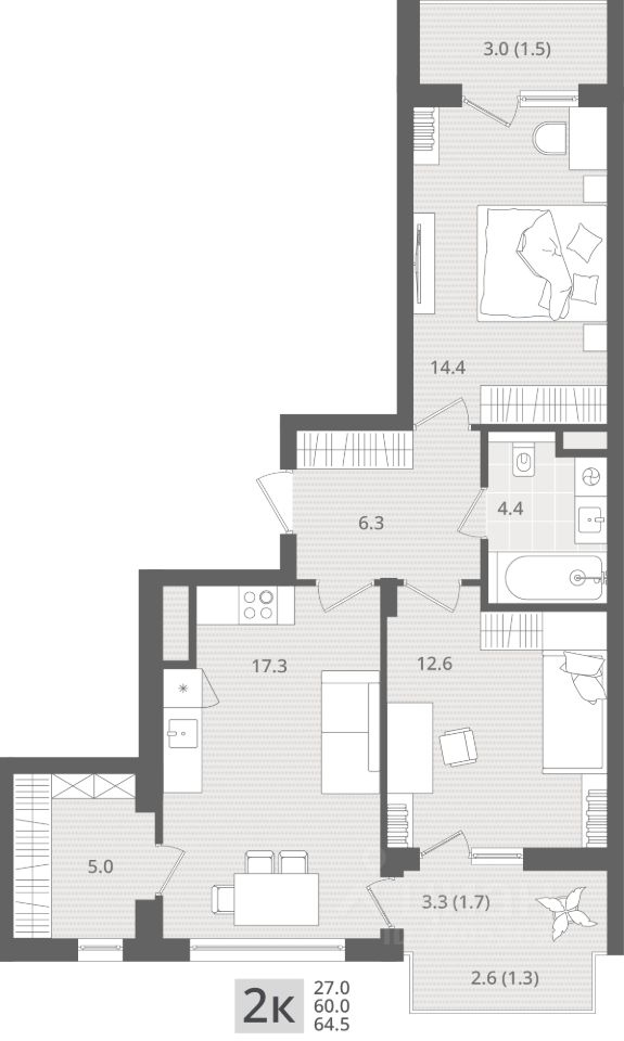 Продаётся 2-комнатная квартира в строящемся доме (Дом 1.1), срок сдачи: IV-кв. 2026, общей площадью 64.5 кв.м., на 5 этаже. Новый жилой комплекс ''МОре'' от Строительной компании ''Меркурий'' расположен по адресу: Калининградская область, г. Пионерский, пос. Рыбное.