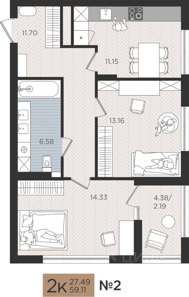 Продаётся 2-комнатная квартира в строящемся доме (Дом 5), срок сдачи: I-кв. 2027, общей площадью 59.11 кв.м., на 2 этаже. Новые жилые дома от Специализированного застройщика ''Самолет Калининград Плюс'' расположены в г. Калининград на ул. Советский проспект.