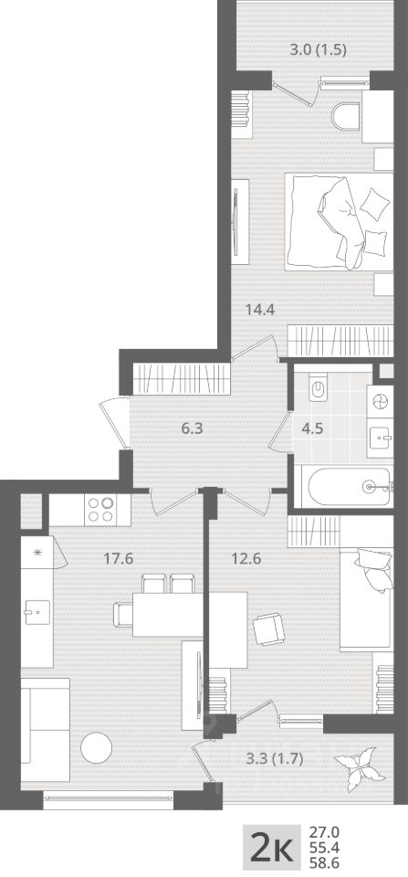 Продаётся 2-комнатная квартира в строящемся доме (Дом 1.1), срок сдачи: IV-кв. 2026, общей площадью 58.6 кв.м., на 1 этаже. Новый жилой комплекс ''МОре'' от Строительной компании ''Меркурий'' расположен по адресу: Калининградская область, г. Пионерский, пос. Рыбное.