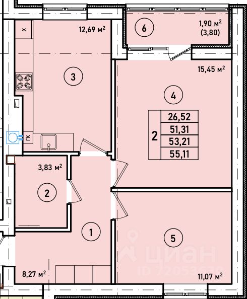 Продаётся 2-комнатная квартира в строящемся доме (Дом 1), срок сдачи: III-кв. 2026, общей площадью 53.21 кв.м., на 1 этаже. Современный жилой 7-ми этажный дом в сердце города.